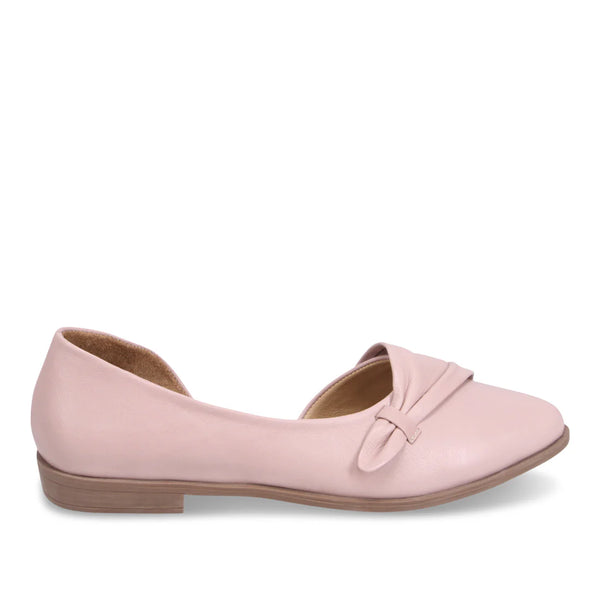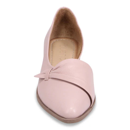 Leather accent on the toe of Birdie. Unique pair of flats with a bow on the side. Bueno flats cradle the foot and protect you from the elements.